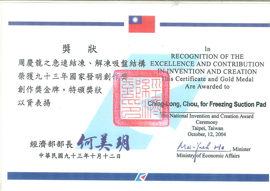 2004.10 | National Invention Award | Ministry of Economic Affairs | Rapid Freezing Suction Pad |